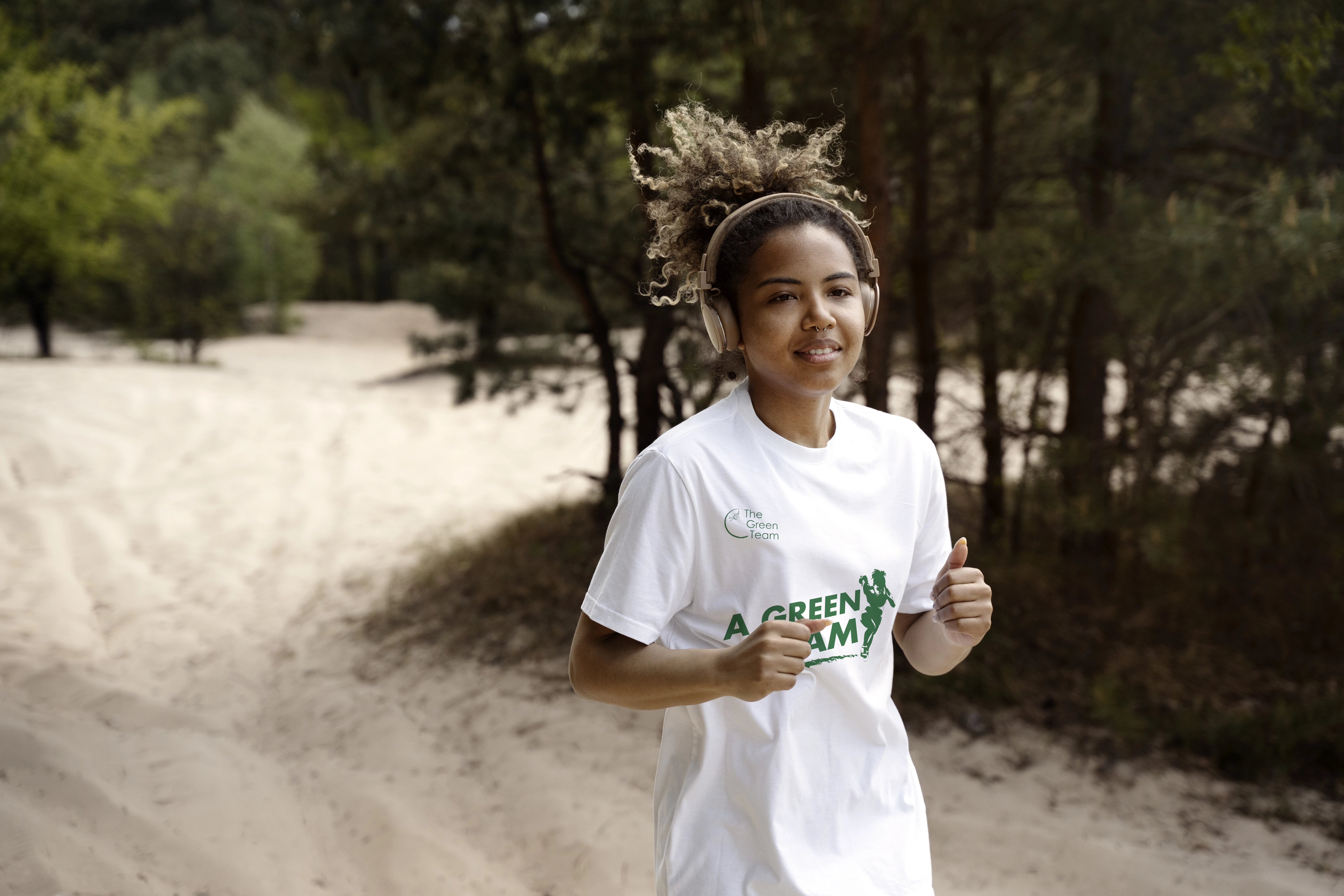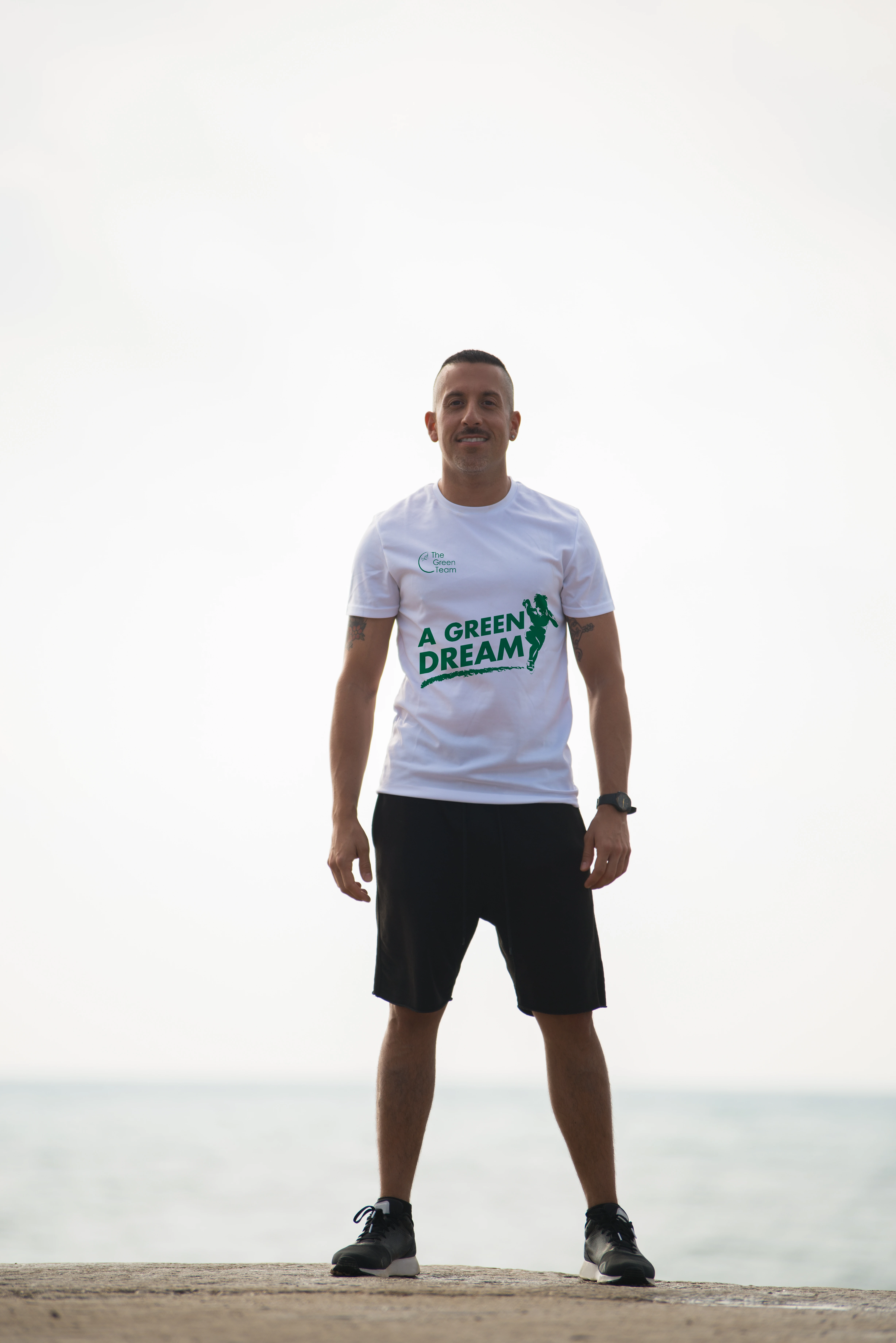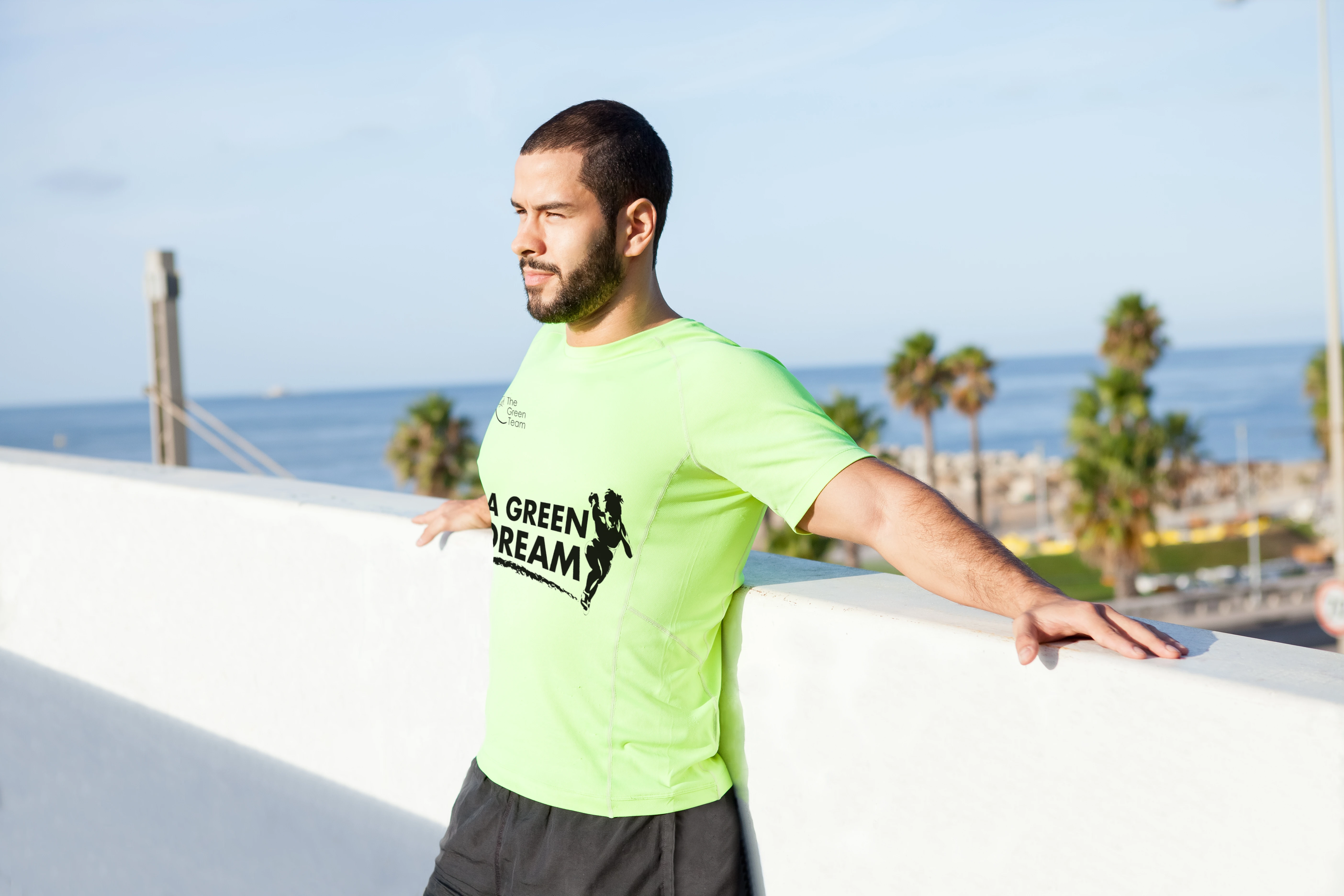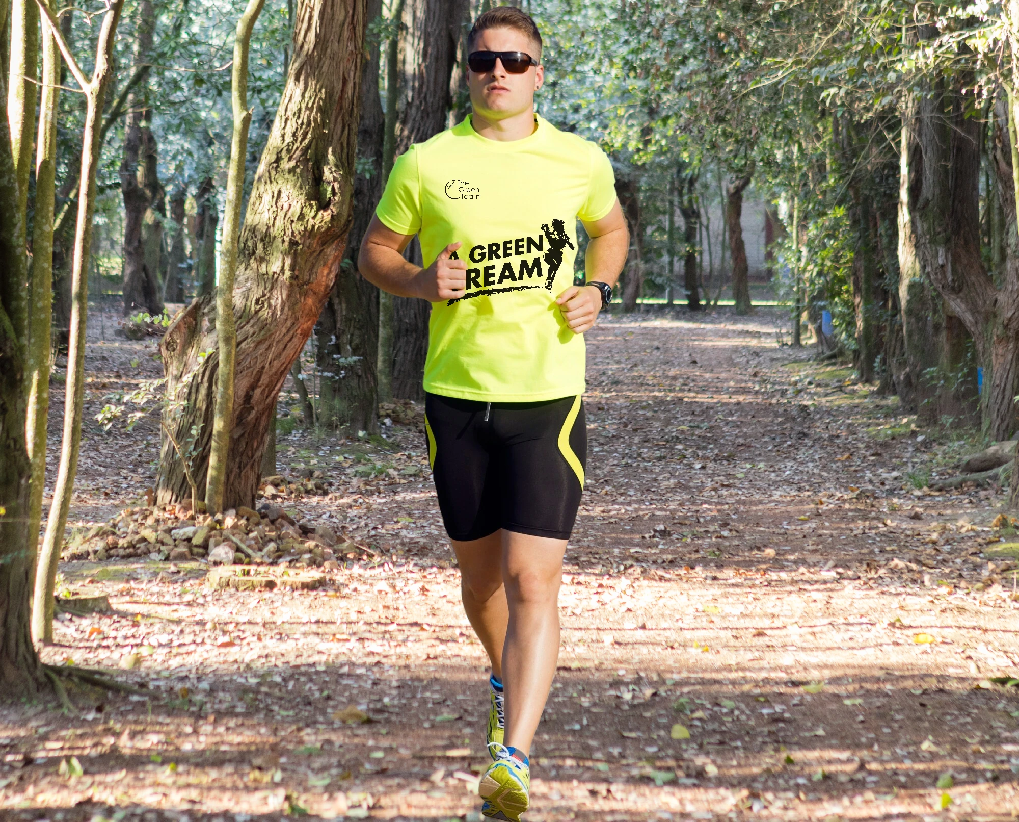 1. Imagen frontal: Se propone un logotipo que combine elementos relacionados con el deporte y la naturaleza, como un corredor atravesando el torso de la camiseta con la frase "A Green Dream", enfatizando el sueño y la visión de la organización hacia un mundo más verde y sostenible. Los colores serán predominantemente verdes, para reflejar el compromiso con el medio ambiente.